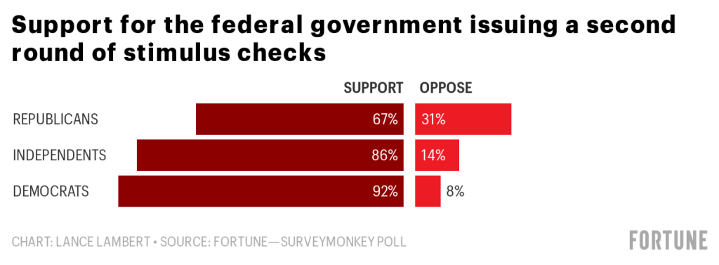 A Fortune-SurveyMonkey poll* of 2,802 U.S. adults between July 17 and 21 finds 80% of U.S. adults support the federal government issuing a second round of stimulus checks. That’s up from 54% of U.S. adults who supported a second of stimulus checks back when Fortune-SurveyMonkey polled U.S. adults between May 20 and 26.