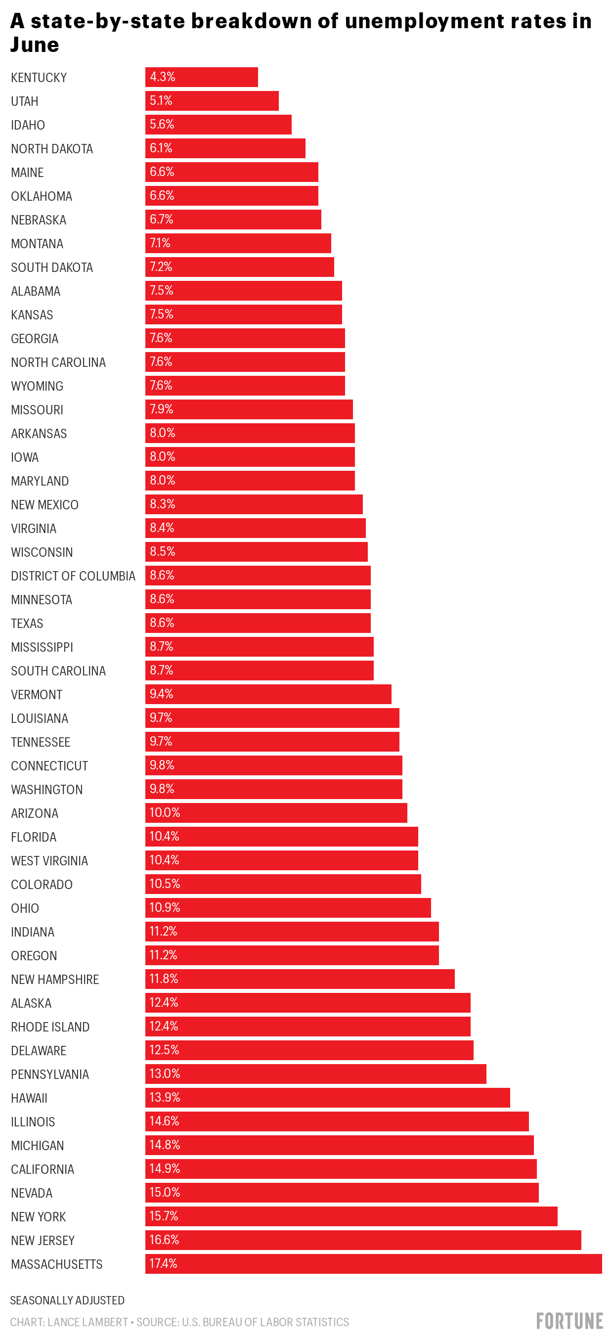 Then there are places that have seen little to no recovery. The jobless rate in New Jersey and Massachusetts were at 16.3% and 16.2%, respectively, in April. In June, the jobless rate was 16.6% in New Jersey and 17.4% in Massachusetts—the two highest rates in the nation. New York was the third highest at 15.7% in June. Those rates are on par with the Great Depression era, which saw an average of a 17% jobless rate during the 1930s.