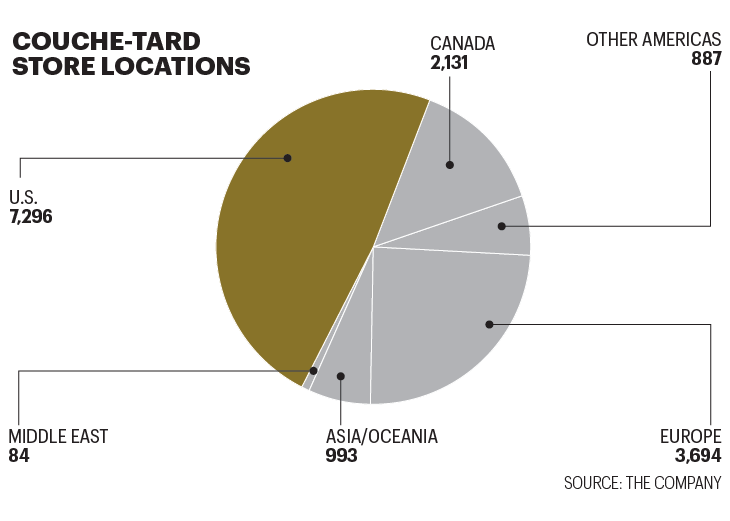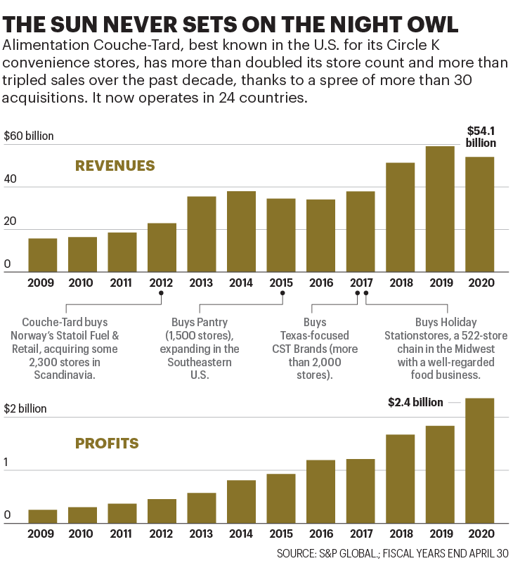 Having started in 1980 as a single store, Couche-Tard (pronounced “koosh-tar,” it means “late sleeper” or “night owl” in French) now owns or licenses more than 14,500 “c‑stores” in a network that spans North America and Northern Europe, with outposts in Latin America, the Middle East, and Southeast Asia. Couche-Tard took in $54 billion in sales in its 2020 fiscal year, making it Canada’s third-biggest company. But the U.S. accounts for 70% of its revenue, and its stateside footprint could get bigger. In late July, the company reportedly made an offer to buy the 3,900-store Speedway chain from Marathon Petroleum. Although that bid was unsuccessful, Couche-Tard has signaled that it’s still on the hunt.