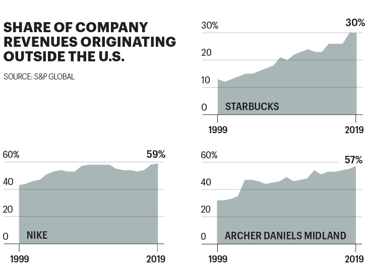 Market-based economies, naturally, need markets. And in order to thrive, businesses in those market-based economies need to either expand existing markets or find new ones. America’s free-spending, high-living, 328-million-strong population makes for a pretty robust cohort of consumers—but outside its borders are nearly 7.5 billion more who might be turned into possible customers one day. Starbucks, which makes its Global 500 debut this year (at No. 478) figured this out early, and now gets 30% of its $26.5 billion in revenue outside the U.S. (see chart). With a compound annual growth rate of over 22% since 1999, Starbucks’ international sales are growing about a third faster than domestic sales. Nike (No. 322), the pride of Beaverton, Ore., now gets 59% of its sales outside America; Archer Daniels Midland (No. 168), purveyor of the American breadbasket, gets 57%.