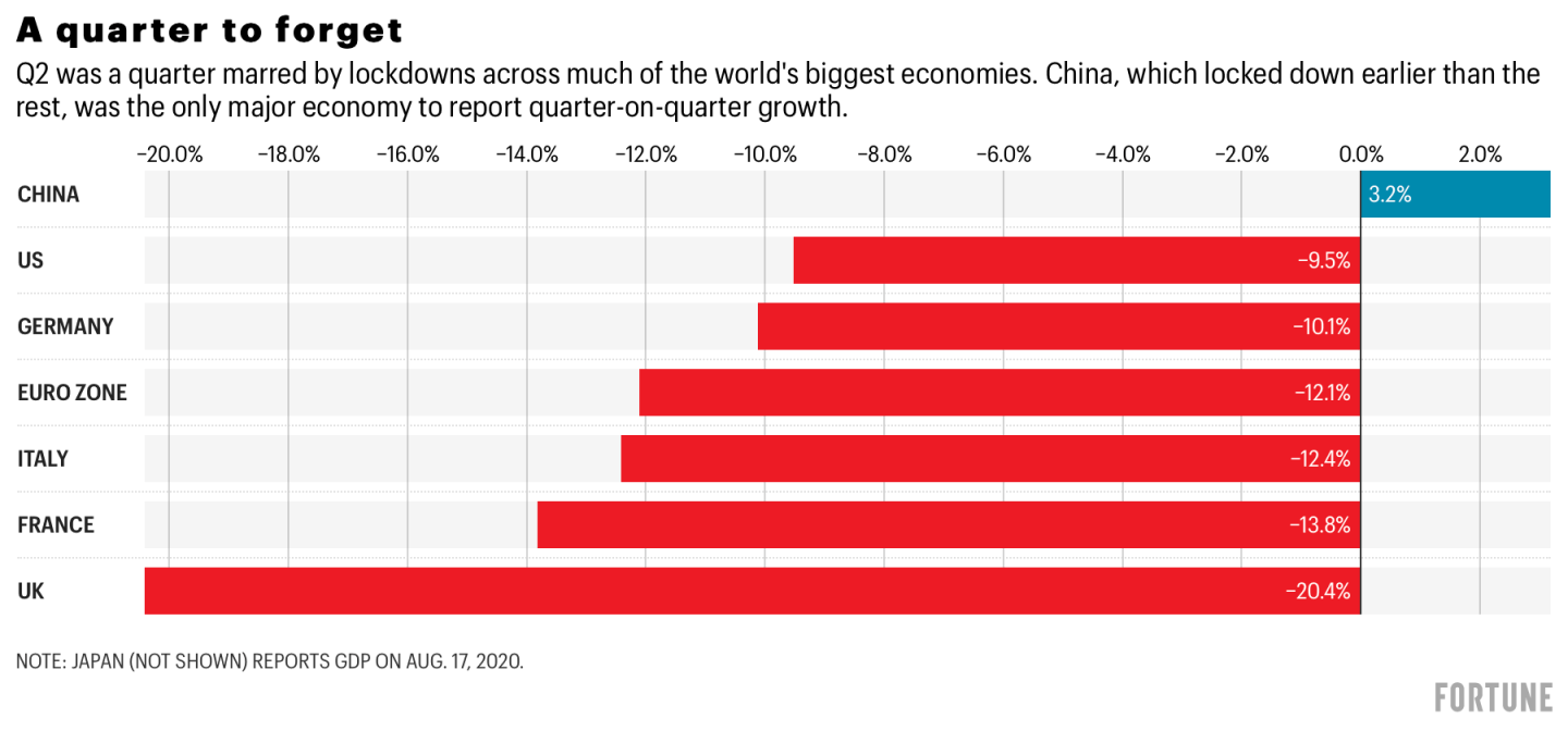 Now is as good a time as any to check in on the health of the world’s biggest economies. The U.K. yesterday reported dismal Q2 figures, meaning all G7 nations (with the exception of Japan) have now detailed how badly their economies contracted in the lockdown-slammed quarter.