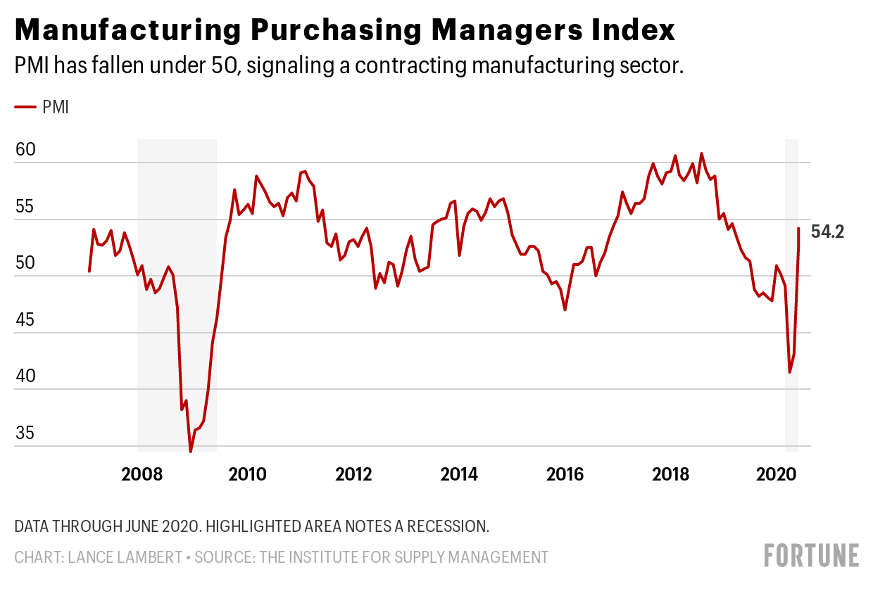 The Great Recession hammered construction and manufacturing. But this time housing—which is still seeing bidding wars—and manufacturing are among our bright spots. The Institute for Supply Management’s Purchasing Managers Index (PMI) came in at 54.2 in June, up from 41.5 in April and 52.6 in May. A PMI below 50 signals a contracting manufacturing sector. So that means U.S. manufacturers are growing again.