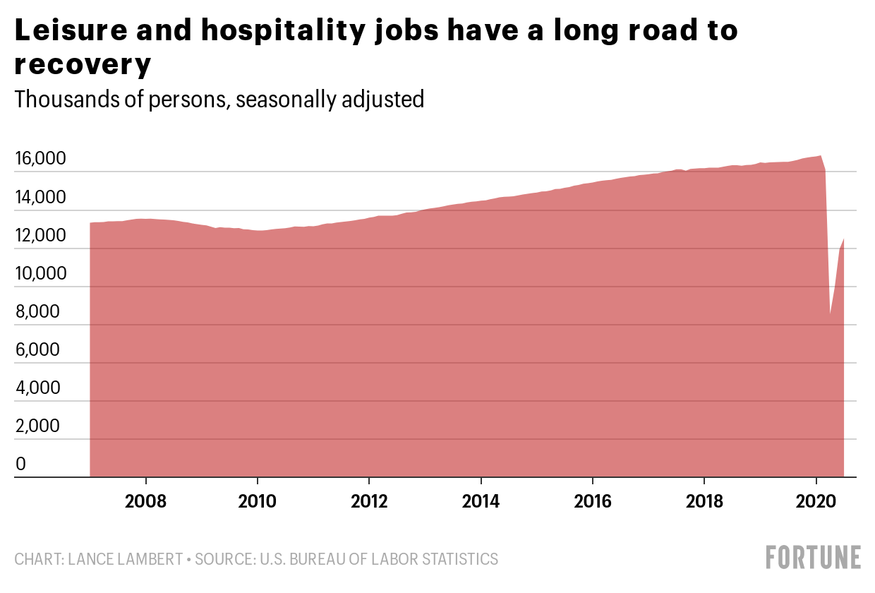 The pandemic was a gut punch to tourism and service jobs. In fact, the number of U.S. leisure and hospitality jobs fell from 16.9 million in February to 8.5 million by April—fewer than the 9 million employed in the sector back in 1989.