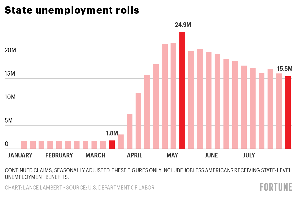 The total number of Americans currently receiving unemployment benefits—called continued claims—came in at 15.5 million in the week ended August 1. That is down substantially since the peak of 24.9 million the week ending May 9, but a far cry from the 1.8 million on the unemployment rolls back in early March.