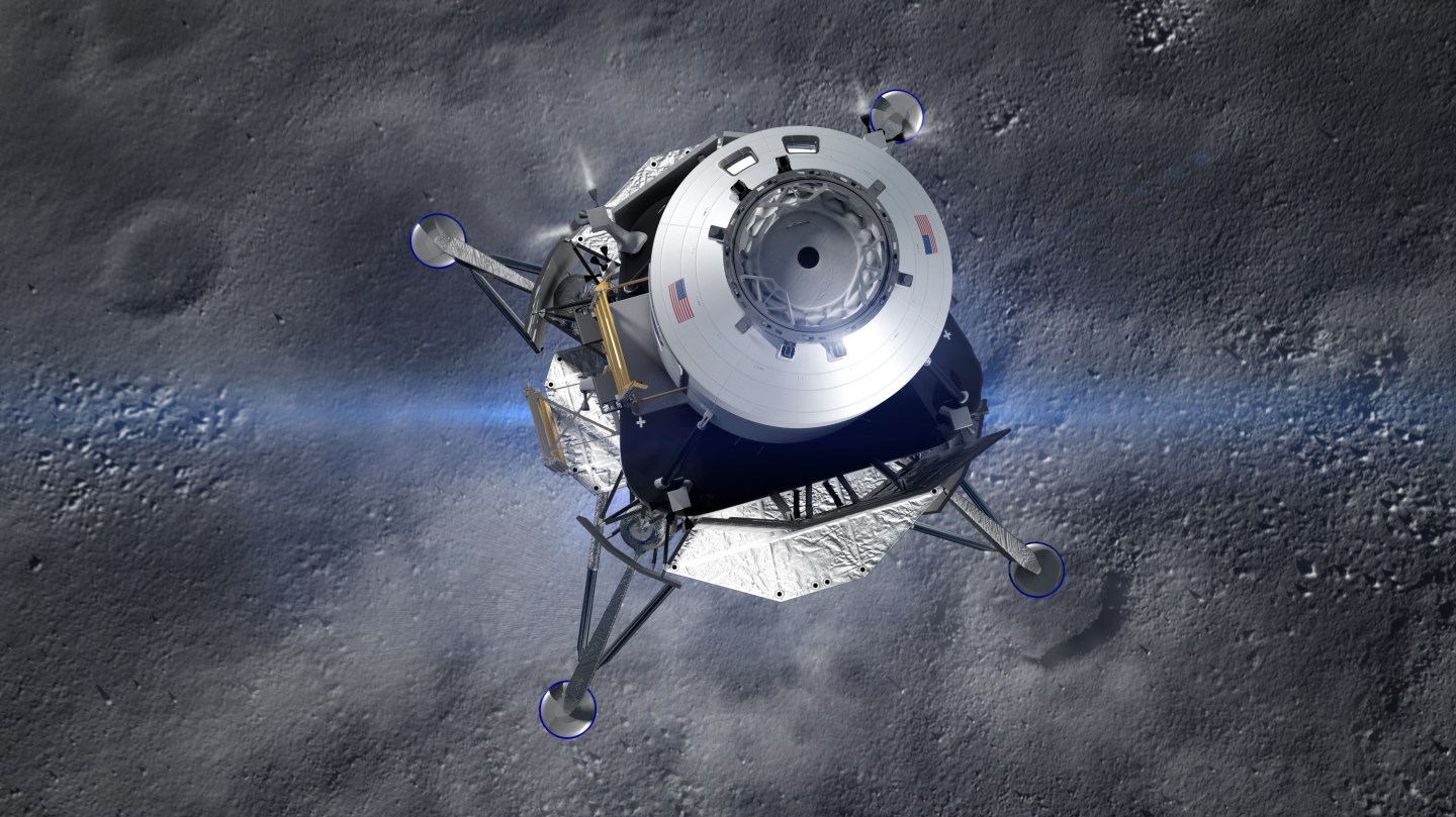 The craft was designed by the team of Blue Origin, Lockheed Martin, Northrop Grumman, and Draper—known as the National Team in the moon-landing competition. The other two teams are Elon Musk’s SpaceX and Alabama rocket maker Dynetics.