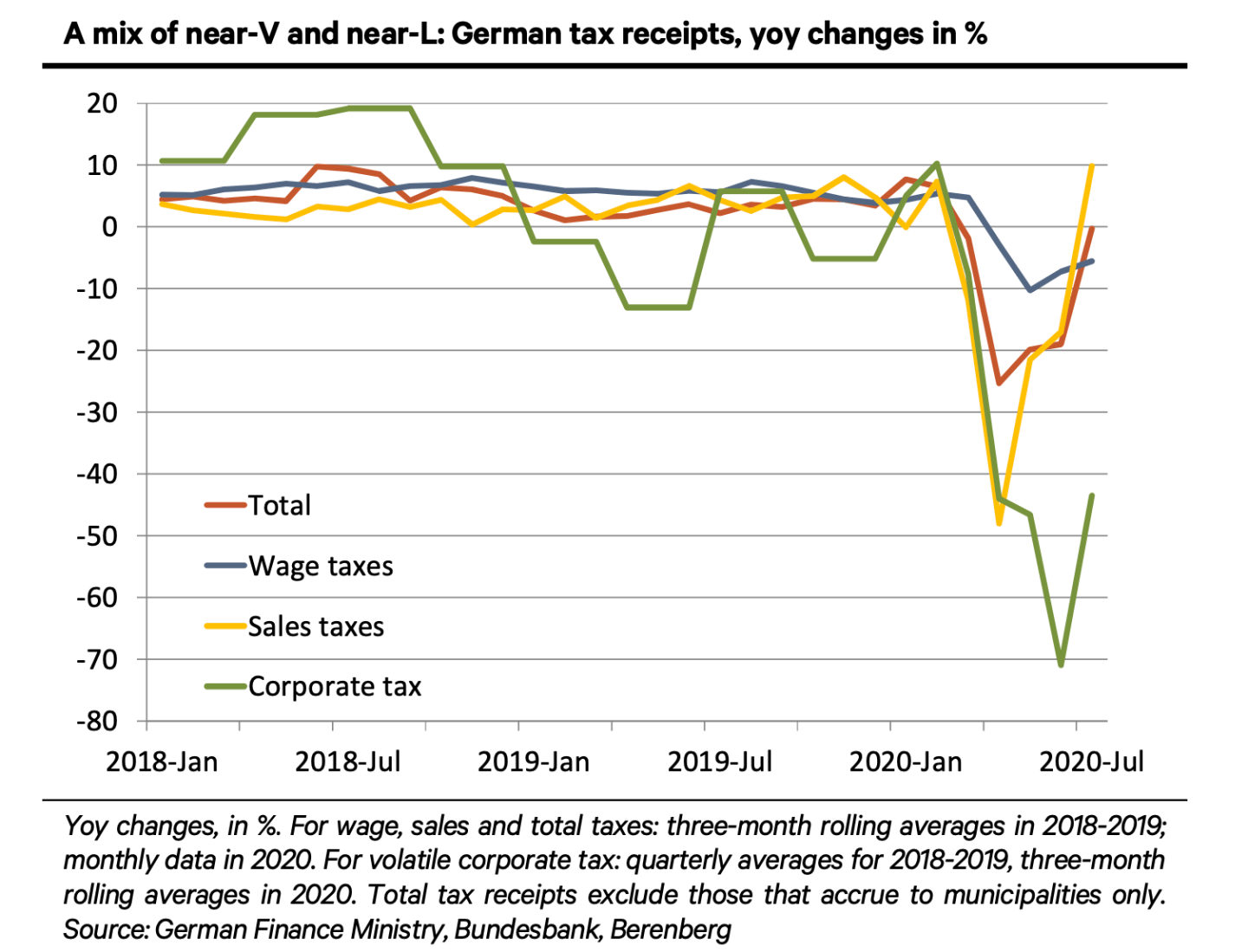 The U.K. isn’t the only European country to see consumption returning in force. As outlined in a Friday Berenberg note, receipts from sales taxes in Germany have “rebounded almost like a V.” Retail sales in that country were already up year on year during May and June, by 5.2% on average.