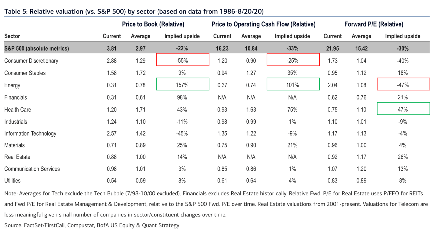 What’s “implied upside”? BofA bases it “on comparing the current relative multiple vs. the historical average relative multiple. Industries with <10 yrs of data history are excluded.”