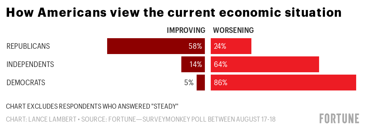 However, only 27% of U.S. adults see the economy as improving, while 57% say the economy is still getting worse. That’s the finding from a Fortune-SurveyMonkey poll of 2,478 U.S. adults between August 17 and 18.