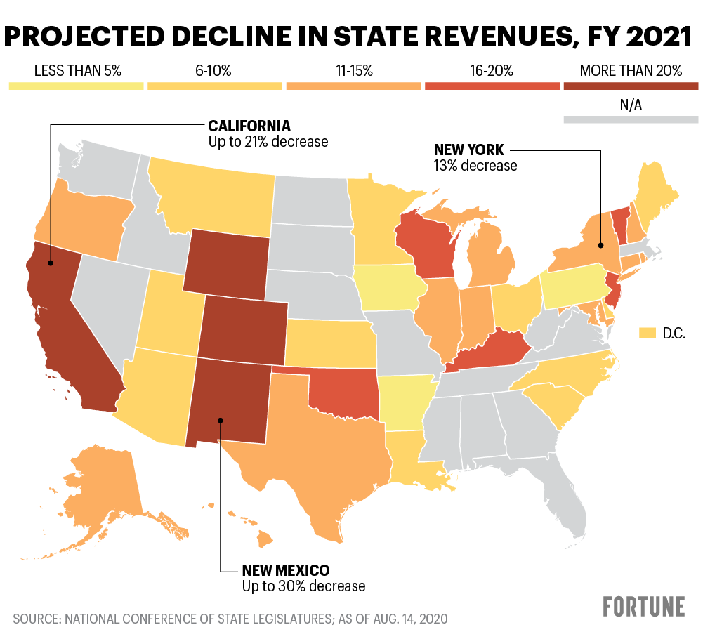 New Jersey now expects to be $10 billion in the hole, the state says. California predicted in May that state coffers would have an $18 billion shortfall—if the recession and recovery ended up looking like a “U” (with a brisk comeback following the equally brisk collapse this spring). An “L-shaped” recovery, for that matter, would leave it $31 billion underwater. That assessment, notably, came before this summer’s catastrophic and costly wildfires.