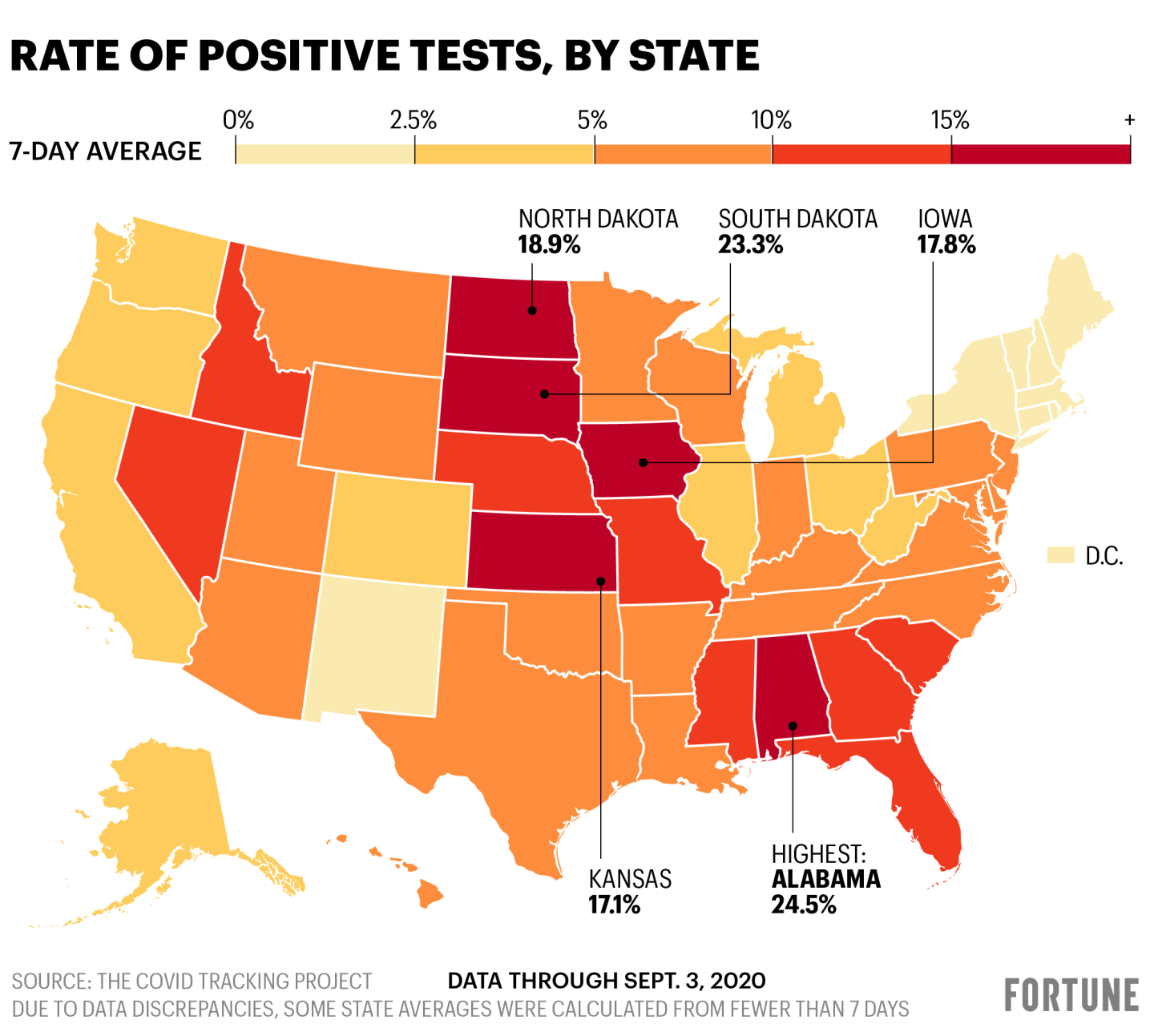Confirmed coronavirus infections in the U.S. topped 6 million this week, and while case numbers nationally have recently trended downward, the positivity rate—the percentage of new COVID tests that are positive—in a majority of states is still worryingly high headed into the Labor Day weekend, according to a Fortune analysis of state data aggregated by the COVID Tracking Project.