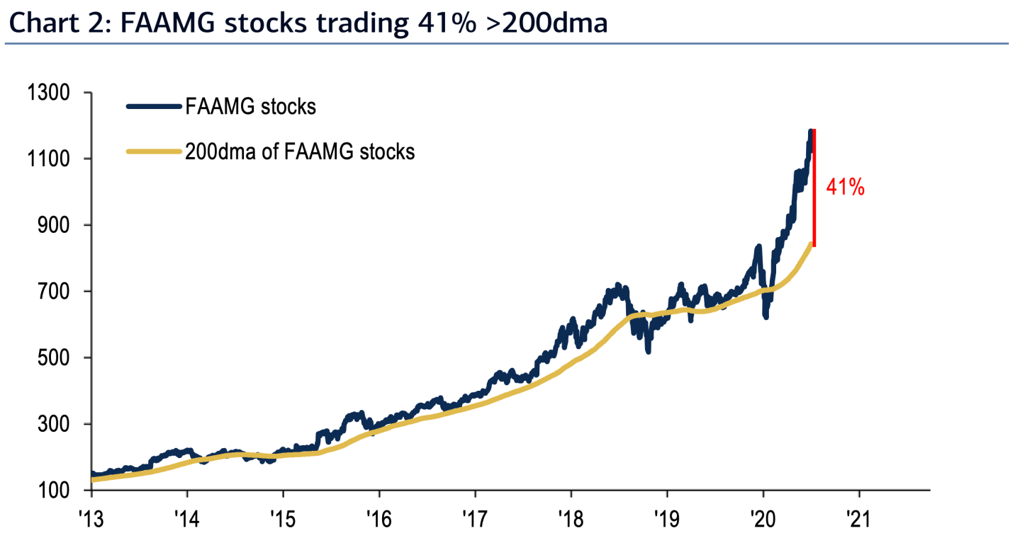 BofA, meanwhile, saw plenty of evidence that tech stocks were overheating. As of the close last Wednesday, FAAMG stocks—Facebook, Amazon, Apple, Microsoft, and Alphabet’s Google—were trading 41% above their 200-day moving average.