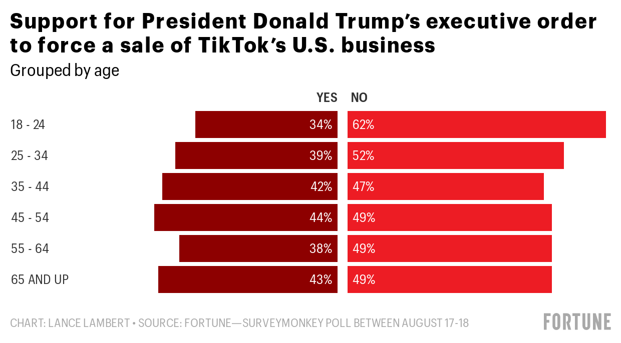 But if Trump—citing security concerns—actually shuts down TikTok will it cost him votes? To find out Fortune and SurveyMonkey teamed up to poll 2,478 U.S. adults between August 17 and 18.*