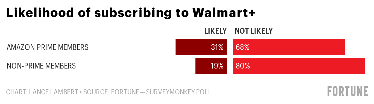 Among Amazon Prime members, 40% of those earning under $50,000 say they’d likely sign up for Walmart+. That group might be unlikely to pay for two subscriptions, and could drop Prime altogether. That’d end up a massive blow to Prime’s 112 million U.S. membership base.