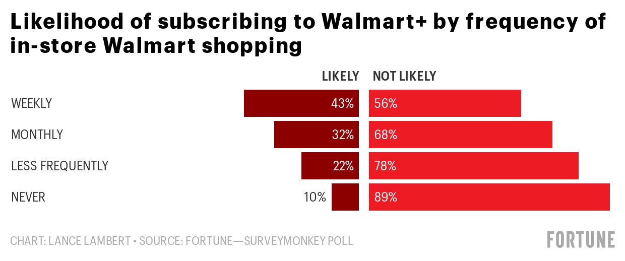 But it’s frequent in-store Walmart shoppers who are the most likely to say they’ll sign up for Walmart+. Among weekly in-store Walmart shoppers, 43% are likely to get Walmart+. 32% of monthly shoppers say the same.