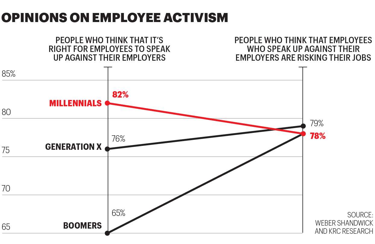 Today’s employee activism is explained in part by the psyche of millennials, for whom such seemingly bizarre behavior doesn’t seem bizarre at all. They’re just as aware as their elders that it risks getting them fired, says 2019 research from Weber Shandwick. They just don’t care as much.