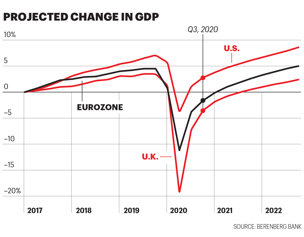 Does that mean Europe will emerge from COVID in better shape than America? Berenberg’s Schmieding thinks so. The U.S. economy will reach pre-pandemic GDP in Q2 2022, around the same time as the eurozone’s biggest economies, Germany and France. But, he adds, “the eurozone clearly is emerging in better shape.”