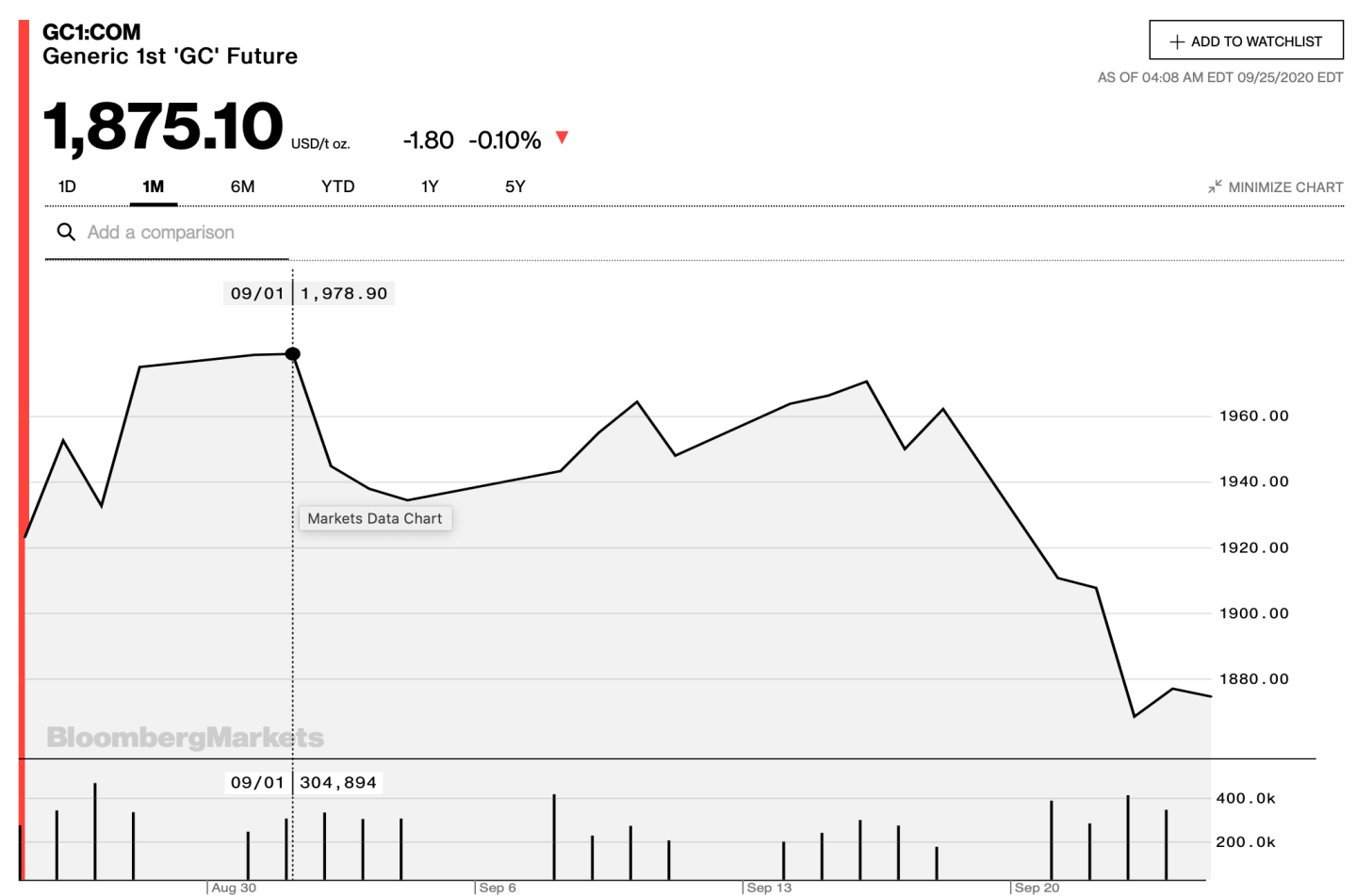-9.3%. Gold bugs are having a rough September. The shiny yellow metal is getting pounded as investors pile into another safe haven, the U.S. dollar. Another drop like yesterday would put gold in correction territory from its Aug. 6 high. Silverhas fallen even further in that time. Like tech stocks, gold and silver were riding high just three weeks ago, and have since collapsed as a risk-off mood struck markets.