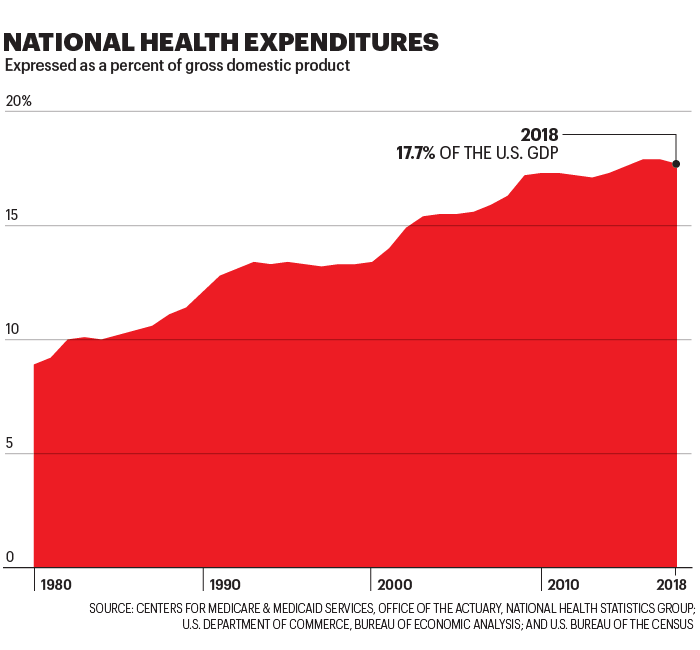 A second pressing issue for the health care industry is America’s ever-growing medical bill, which at last count totaled $3.6 trillion in 2018, or roughly 18% of GDP. In other advanced economies, the rate is 8% to 10%.