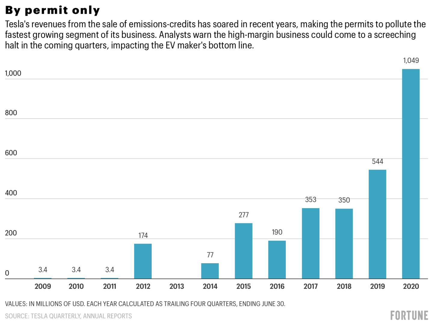 That sumptuous stream of earnings—accounting for all of Tesla’s operating profits in the first half of 2020, by Fortune’s estimate—has probably peaked, and will begin a long slide before pretty much vanishing in a few years.