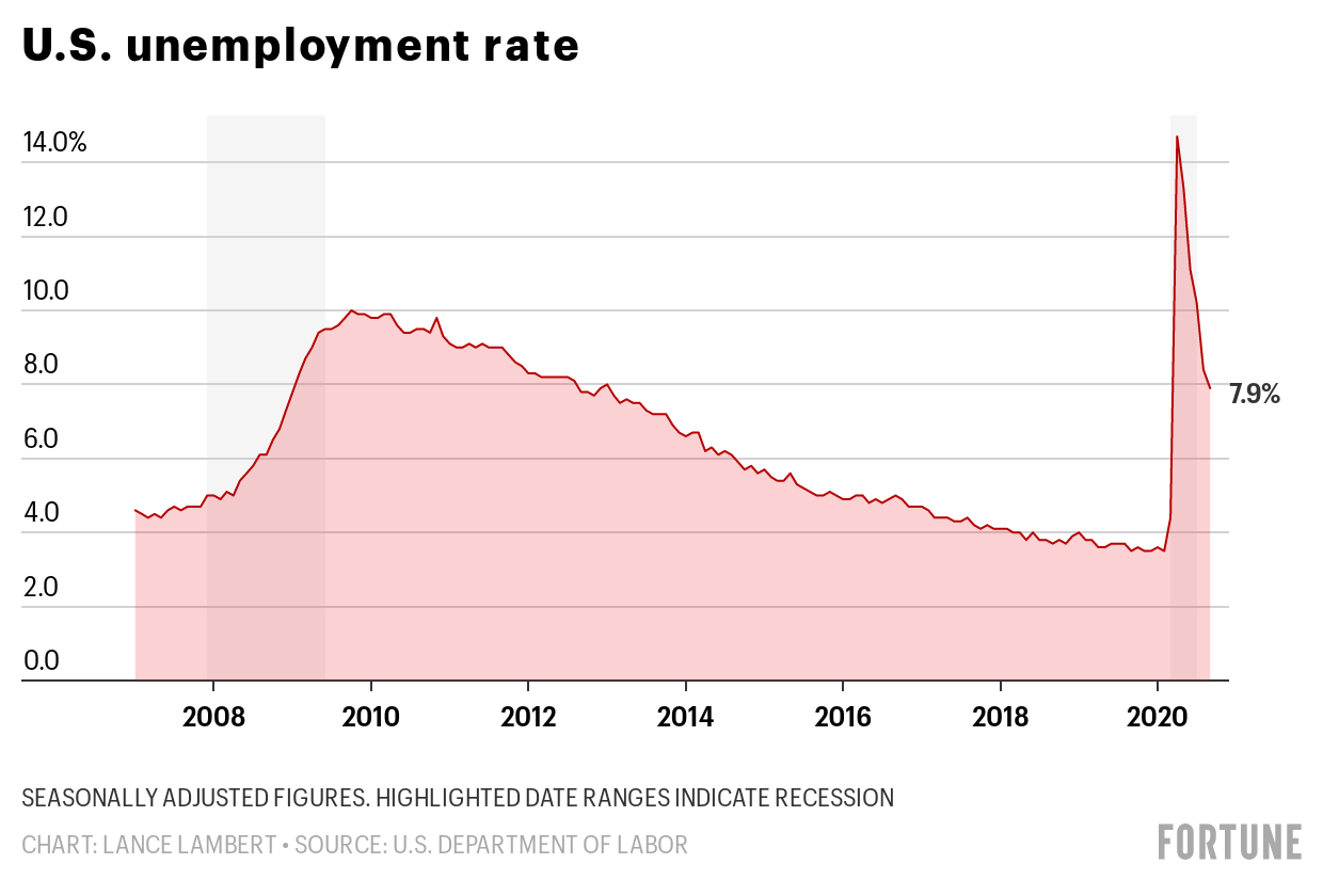 The unemployment rate in September dropped to 7.9% from 8.4%. That marks five consecutive months of a declining jobless rate after peaking at an 80-year high of 14.7% in April. But it’s still well above the pre-pandemic rate of 3.5% in February—a 50-year low.