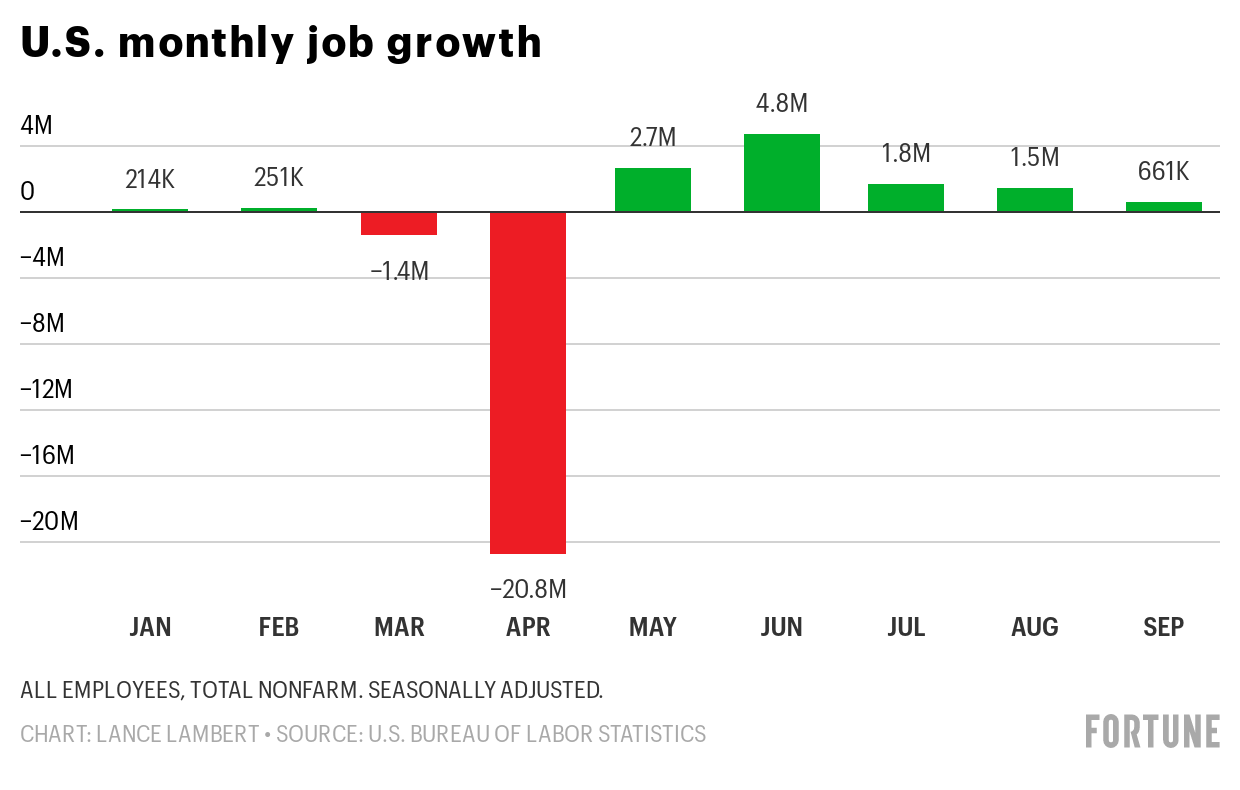 U.S. employment rose by 661,000 in September, bringing the total number of jobs added since May to 11.4 million, according to the U.S. Bureau of Labor Statistics‘ Friday jobs report. But that uptick is down from 1.5 million jobs added in August and 1.8 million added in July.