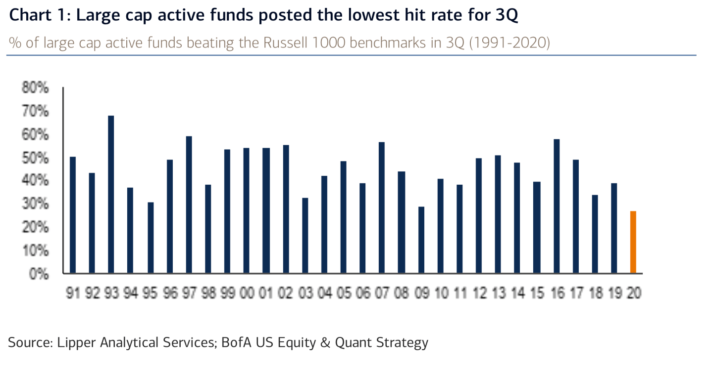 “While US stocks posted the best 3Q in 10 years, only 27% of large cap active managers beat their benchmarks, representing the lowest 3Q hit rate in our data history since 1991,” the BofA investor note read.