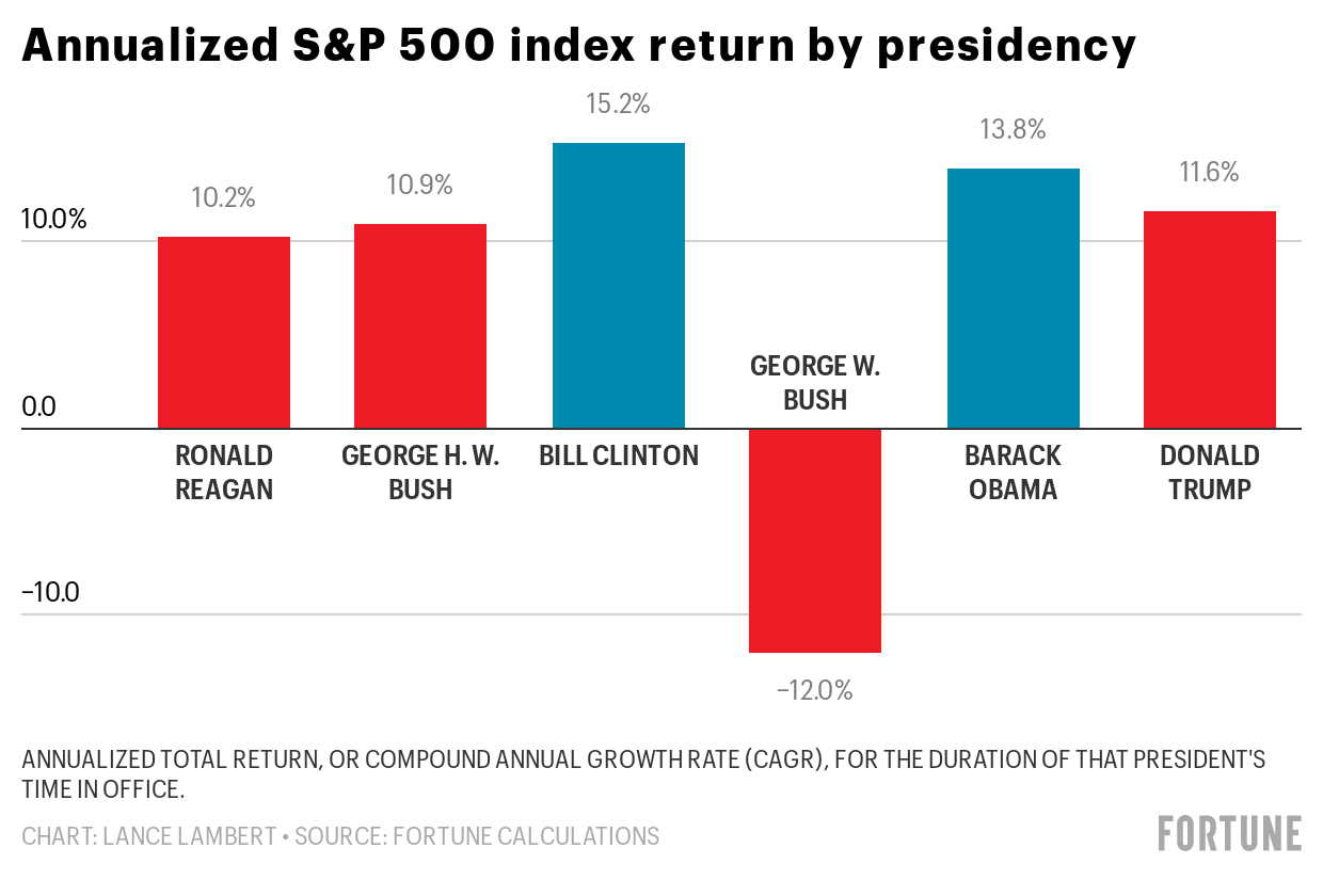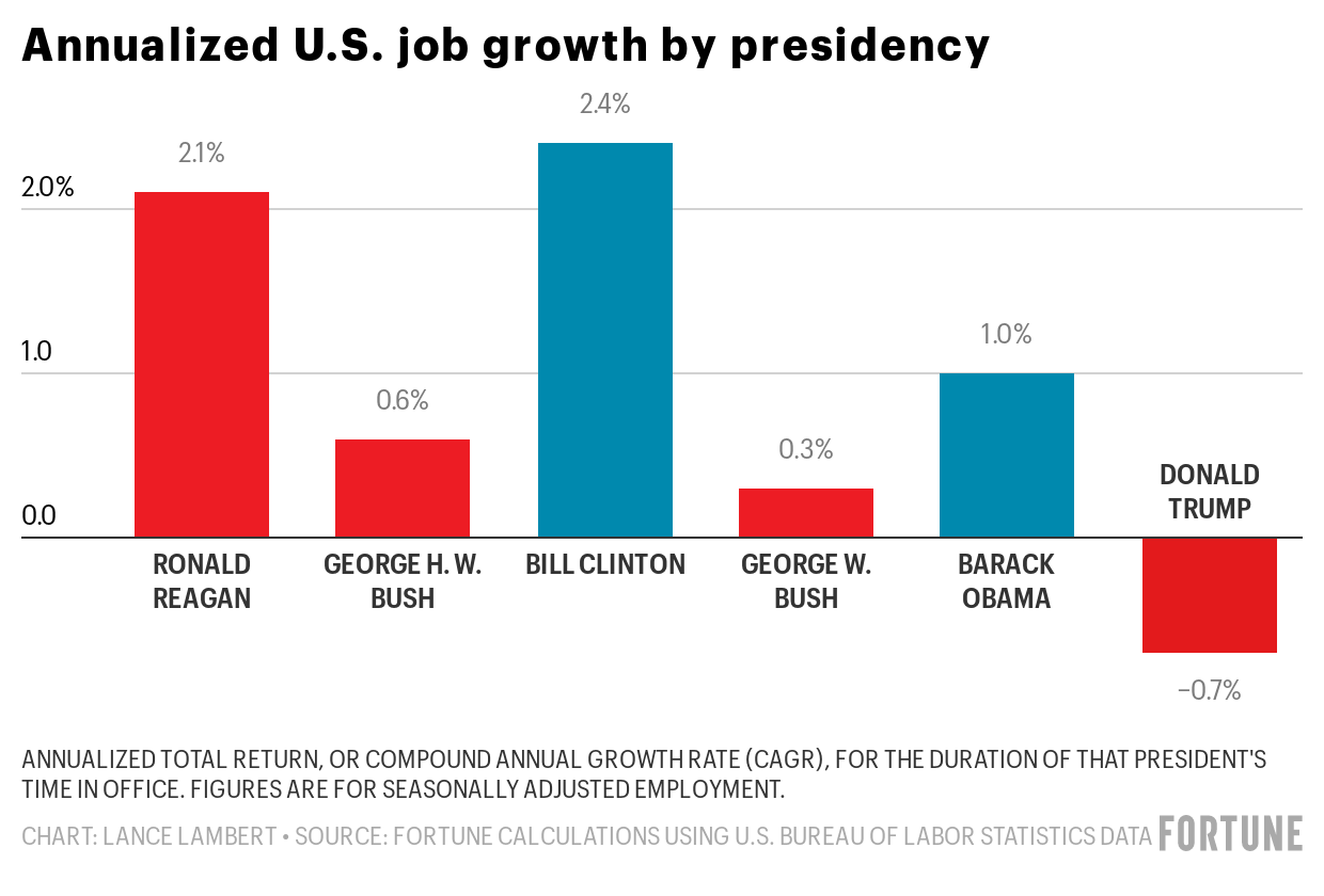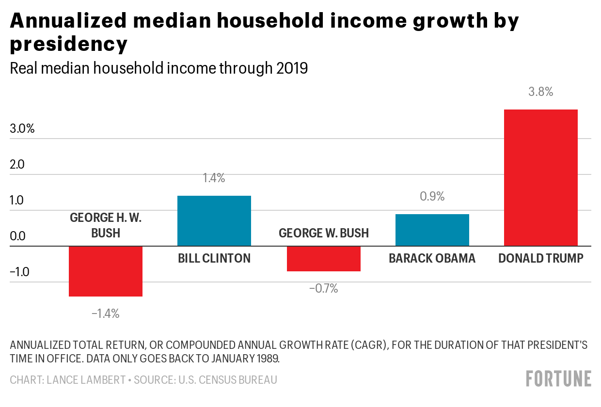 Fortune set out to measure how the economic performance under Trump stacks up to that of recent Presidents. We created annualized returns, or compound annual growth rates, for most of these metrics. That way we could fairly compare eight-year presidencies and four-year presidencies to Trump’s 44-month presidency.