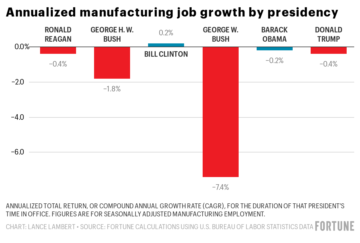 Manufacturing jobs fell during the presidencies of Reagan, George H.W. Bush, George W. Bush, and Obama.