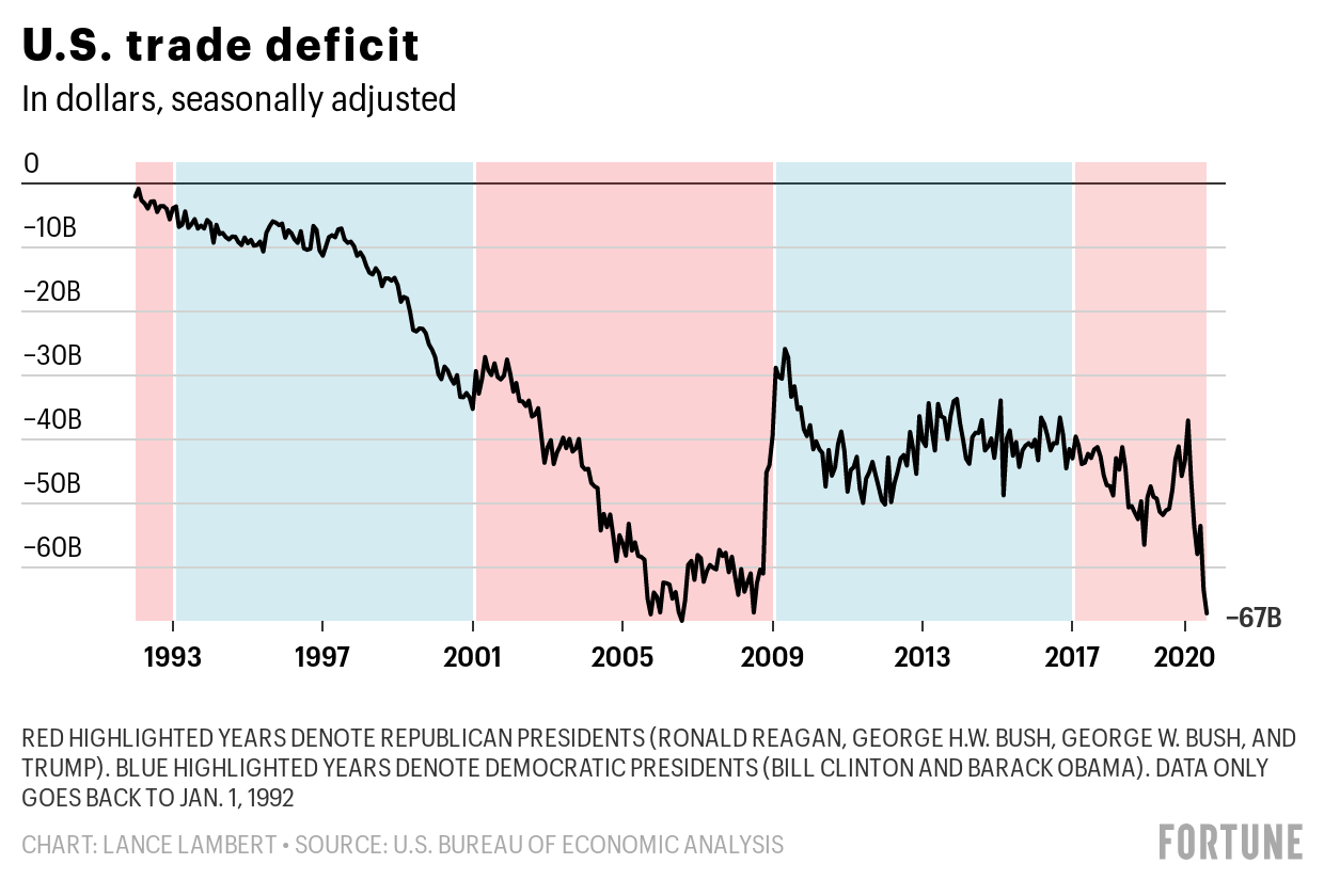 On the 2016 campaign trail, Trump promised to shrink or close the U.S. trade deficit. As President he’d wage a trade war with China, and pressure numerous allies on trade. Prior to the pandemic, the U.S. trade deficit was improving a bit under Trump, coming in at an annual rate of $37 billion in February—down from $42.9 billion when he took office.