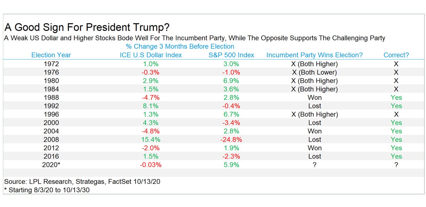 As he wrote Friday, “We’ve noted before that stock market gains ahead of the election historically support the incumbent party, while if stocks are lower it tends to support new leadership in the White House.” Detrick adds that the dollar is another indicator worth watching. “In fact, when stocks are up and the U.S. dollar is lower ahead of the election, or if stocks are lower and the U.S. dollar is higher before an election, the results have accurately predicted the last seven times those scenarios took place. Given stocks are up and the U.S. dollar is slightly lower, this could be one clue the upcoming election will be much closer than many are expecting.”