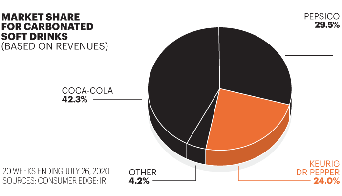 Though KDP is less than half the size of Coke and Pepsi in U.S. soft drinks, it is running neck and neck with the two giants in the share of the extra cans and bottles thirsty stay-at-home Americans are quaffing versus last year. In the 20-week period ended July 26, KDP has grabbed 34.1% of the $1.4 billion increase in revenue for all U.S. carbonated soft drinks, according to Consumer Edge. That boosted its overall market share from 22.7% to 24.0%. “KDP has done the best job of any beverage company in navigating the crisis,” says Consumer Edge analyst Brett Cooper.