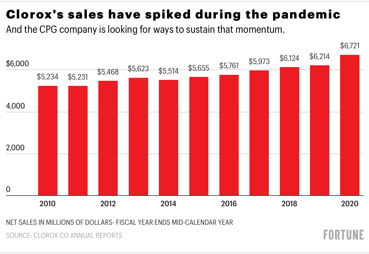 But the COVID crisis has sent Clorox company revenue through the roof, with consumers bulk-buying and hoarding any cleaning products they can find. The boon to Clorox’s business has persisted: Overall sales rose 22% year over year in the company’s fourth quarter. And for the fiscal year ended June 30, Clorox revenue hit $6.7 billion, up 8% from 2019, the company’s best annual gain in more than a decade. The company remains tiny compared to P&G, whose sales topped $70 billion. But Clorox’s shares are up 42% so far in 2020.