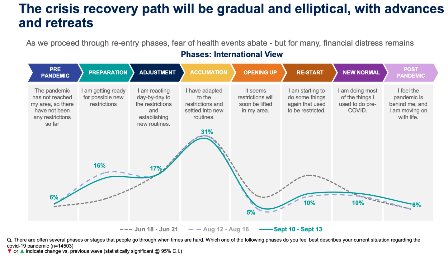 No matter where you look, it’s not a pretty picture. In the Ipsos chart below, you see that virus is still front and center in the minds of most panelists. The percentage of respondents who say that they’re adapting to the restrictions of life with COVID is the most prominent grouping, as represented by the big hump in the center of the chart. Nearly one-third (31%) of respondents would put themselves in the “acclimation” grouping.