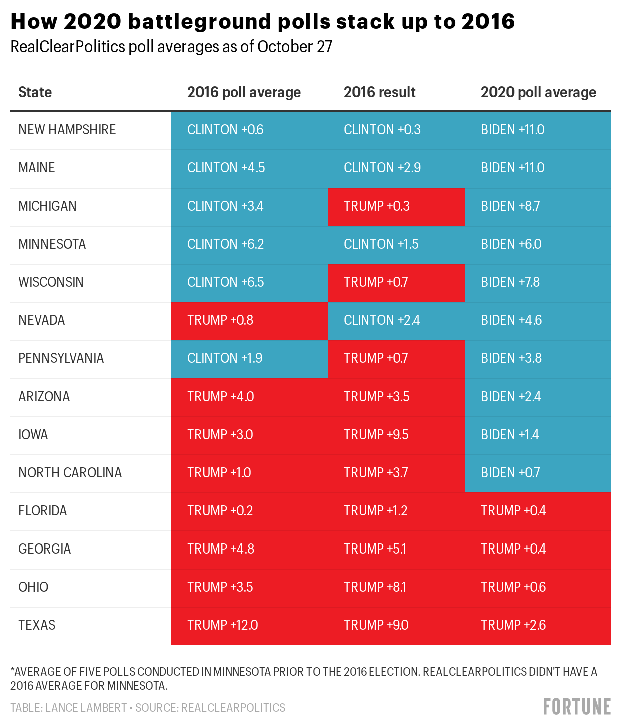 For much of the campaign the President has trailed in the Sunshine State. This week, however, Trump topped the RealClearPolitics poll average in Florida—the first time he’s led Democratic nominee Joe Biden in the metric since April. But it’s a slim lead: Trump is ahead by 0.4 points in the RealClearPolitics poll average in Florida, on par with his 0.2 point lead in Florida four years ago—which translated into a 1.2 point win.