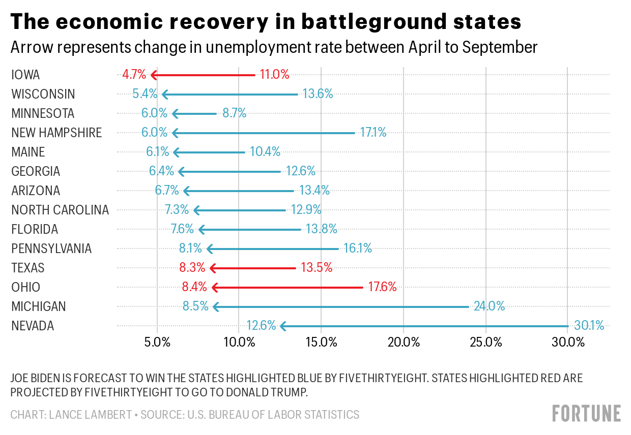 The recovery is much more swift in rural Midwestern states with heavy agricultural economies—which have rebounded relatively quickly. The jobless rate in Minnesota surged from 3.1% in February to 9.9% in May at the height of shutdowns. But as the state reopened its economy over the summer, it fell to 6.0% as of September. But that recovery is hardly aiding Trump in the polls: Biden has a 93% chance of carrying Minnesota.