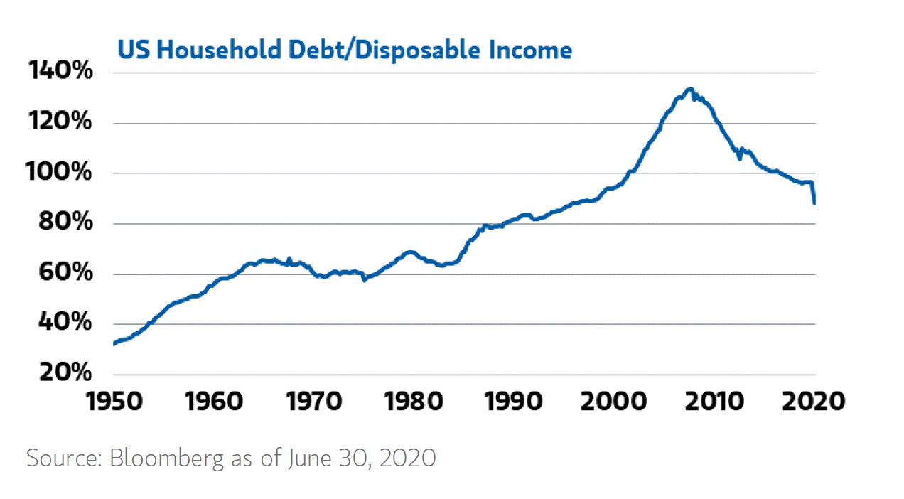 “One unique feature of the current recession,” writes Lisa Shalett, chief investment officer at Morgan Stanley Wealth Management, “is that rather than consumers tapping their credit cards, they have paid down debt, especially relative to disposable income and net worth. In fact, current readings are the lowest since the late 1980s and nearly 50 percentage points lower than during the worst points of the Global Financial Crisis.”