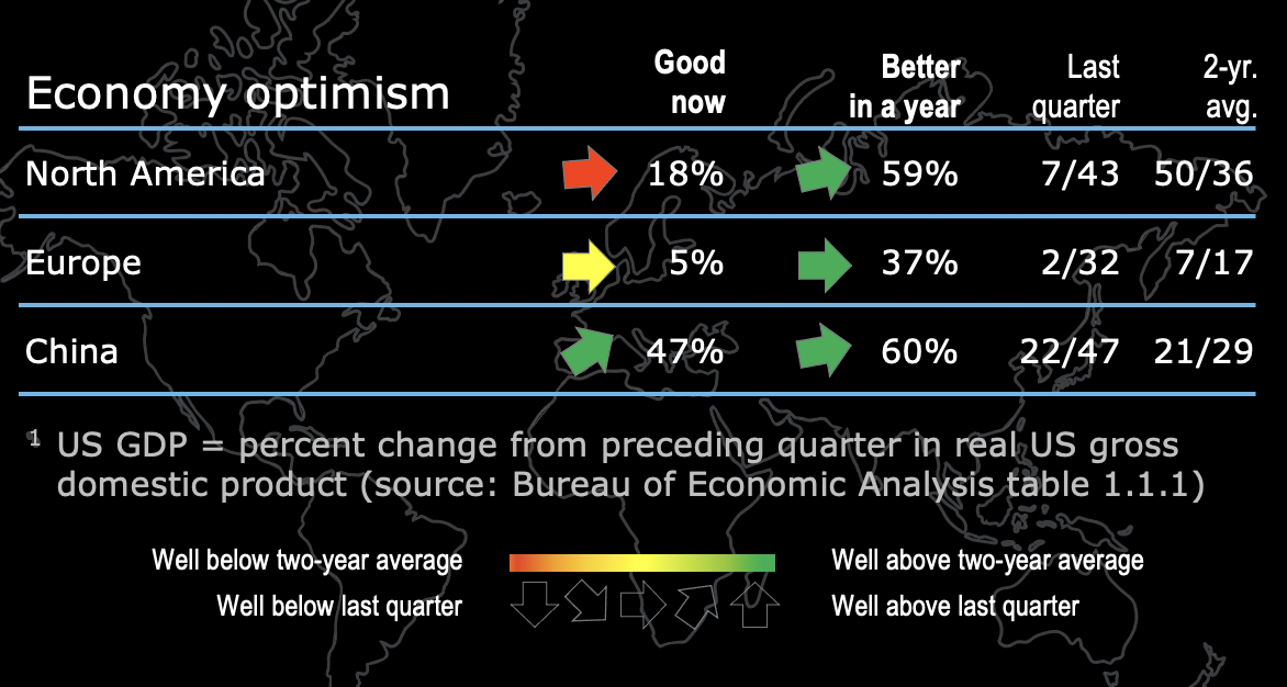The most bullish subset of CFOs can be found in China where nearly half (47%) say the economy is “good now,” and 60% say it will be even better a year from now. CFOs in North America have a similarly rosy outlook, as the graphic above shows. But those same CFOs are concerned about the first half of 2021 as stimulus talks continue to bog down and they maintain cautious optimism about the speed of the vaccine rollout.