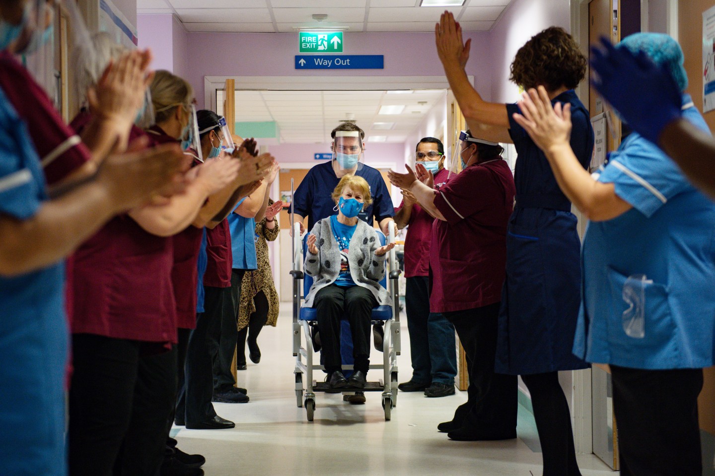 Americans can soon feel like this medical staff celebrating Margaret Keenan, center, becoming the first person in the U.K. to receive Pfizer's COVID-19 vaccine. On Thursday, an FDA panel recommended approval of the same vaccine, clearing the way for the American public to start receiving it within days.