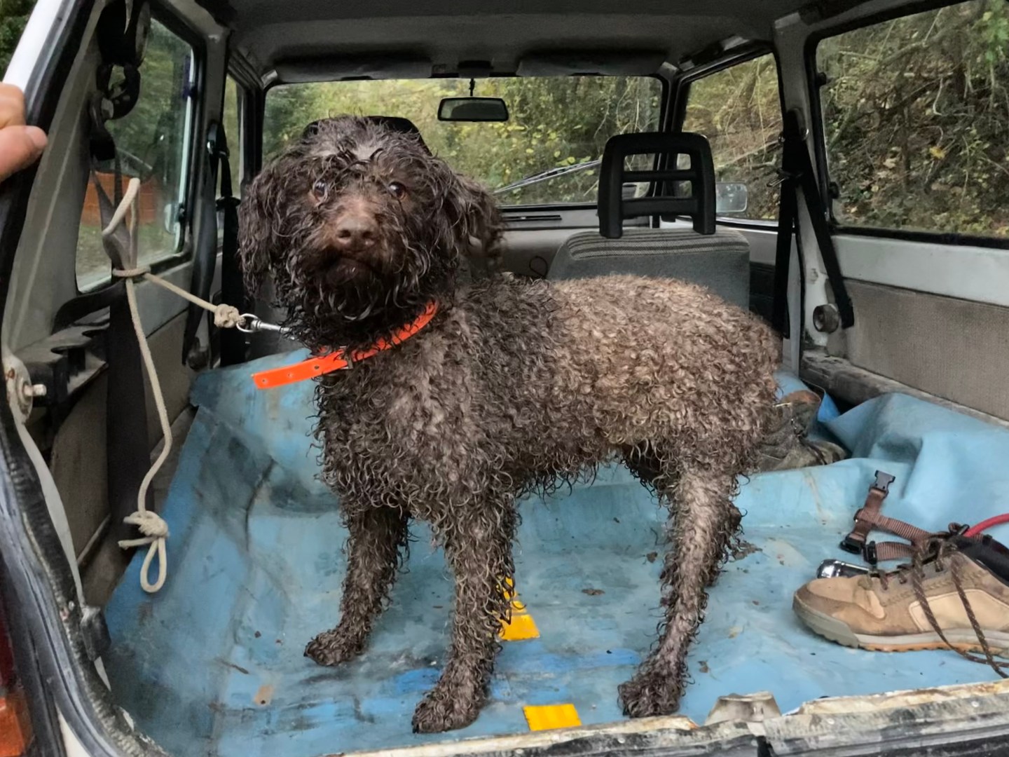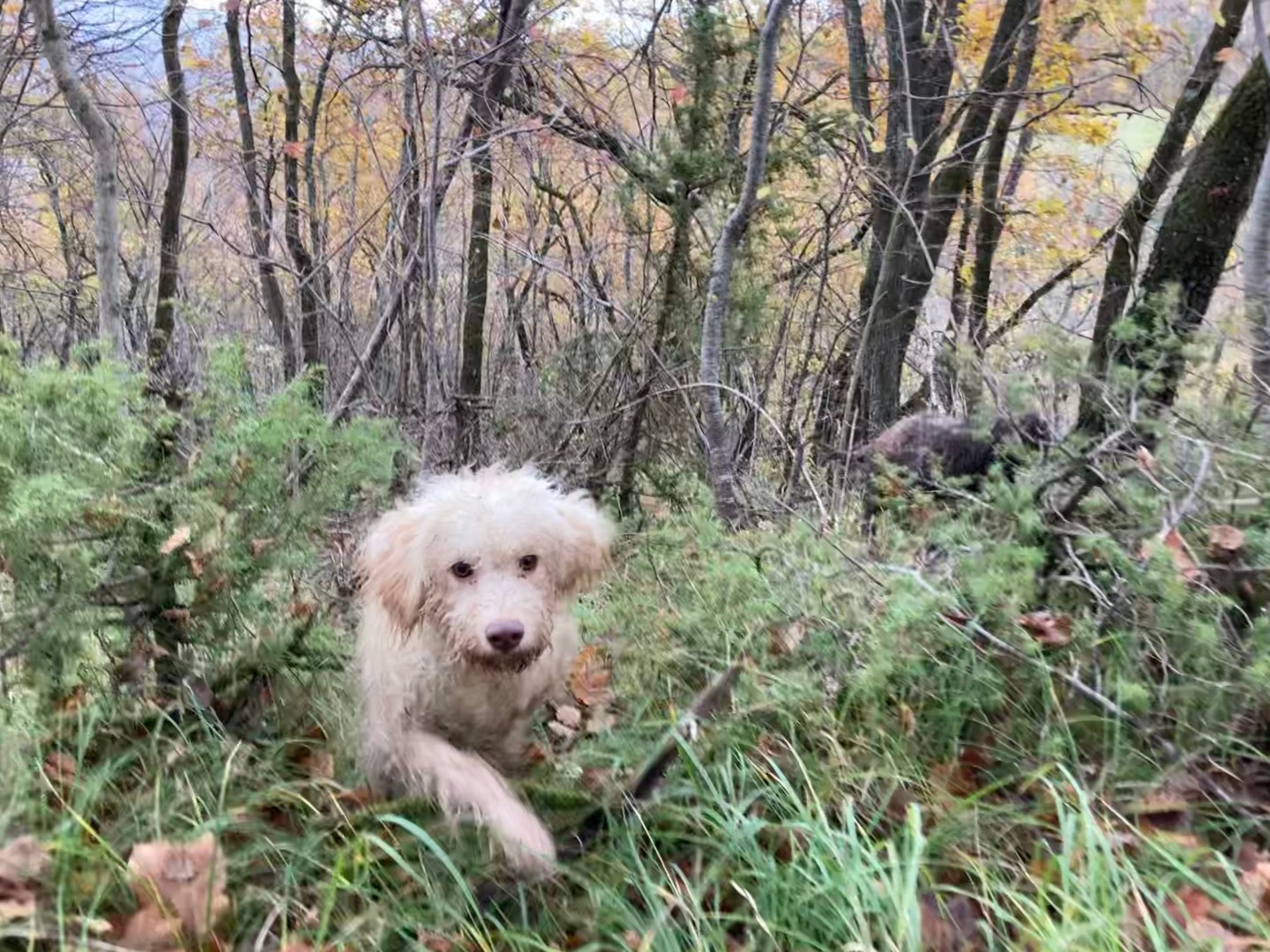 Once we entered the woods, Baldoncini directed Luna with a volley of rapid-fire one-word commands: vai (go ahead!), su (climb up!), giù (come down!). She covered remarkable ground, over tough, steep terrain. My Scilla kept up, admirably darting after Luna. They glided over muddy slop. They scrambled under fallen tree limbs. They hopped over trunks. They found holes in a wall of thick brambles, and splashed through streams. Scilla circled back frequently to check on me. You gonna make it, old man?, her expression seemed to say.