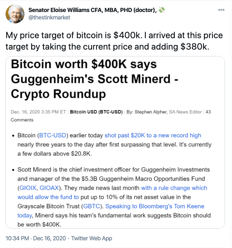 - Bitcoin bulls are lighting fancy cigars with wads of worthless dollar bills this morning. The crypto currency is up an additional 16%, trading, at one point, above $23,000. Next stop? $400,000 (that’s not a typo), says Guggenheim Investment’s Scott Minerd.