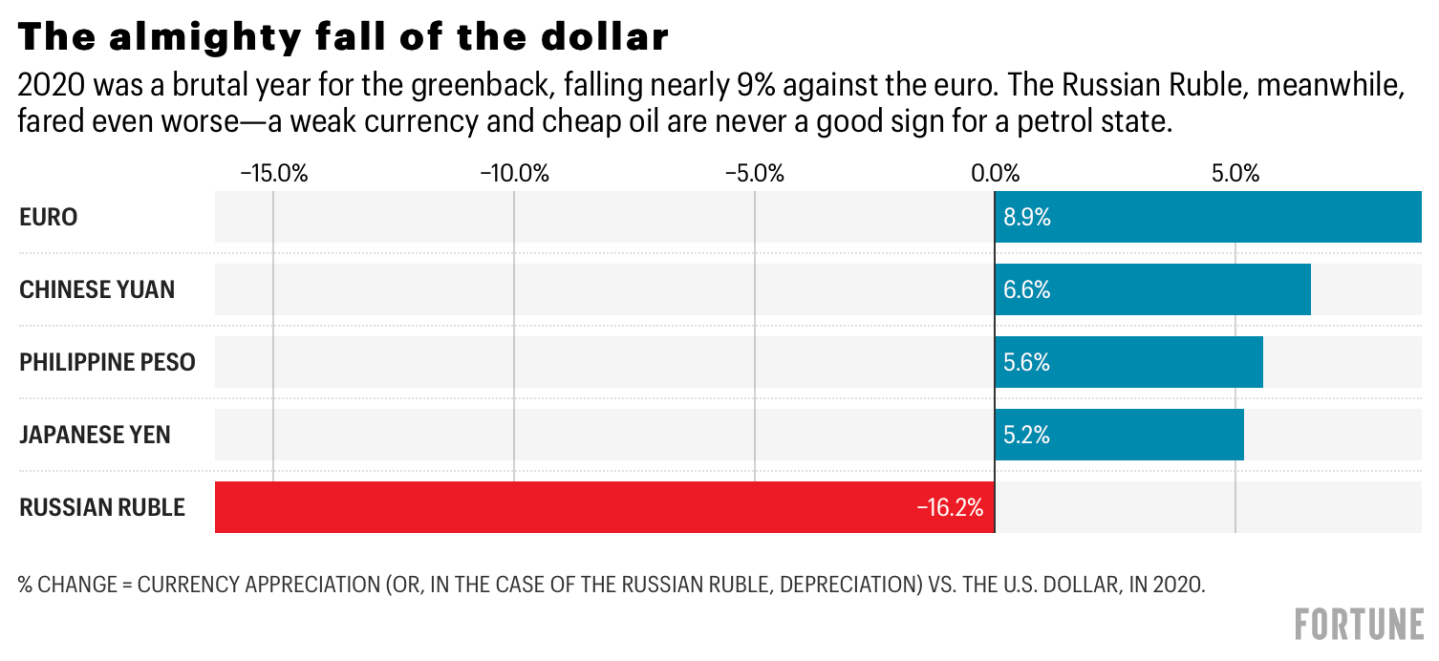 On the flip side, it’s not great news for America’s biggest trading partners—namely, the Eurozone. As such, Goldman Sachs forecasts a year-end 2021 price of one euro equaling $1.28. That would represent a further 4% slide in the greenback from the Dec. 30 EUR/USD FX price, mainly as investors continue to bail on the safe-haven dollar amid unprecedented levels of stimulus pumped into the U.S. economy. In fact, the dollar’s standing as the world’s global reserve currency—a much watched measure—fell to a level last seen in early 1996.