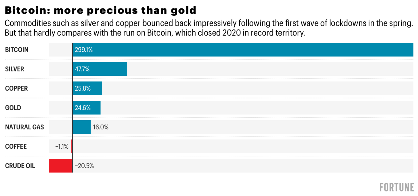 Top of the chart is Bitcoin, which nearly quadrupled in value in 2020. No, Bitcoin is not a commodity in the traditional sense of being a physical object, but it’s worth comparing the digital currency’s bull run with that of gold. The shiny yellow stuff ended 2020 up 24.6%. But it’s been virtually flat since September, just as Bitcoin took off. And Bitcoin’s stellar December rally pushed the crypto currency to the brink of $30,000 by New Year’s Eve. So much for that seemingly overly bullish $20,000 Bitcoin call in November.