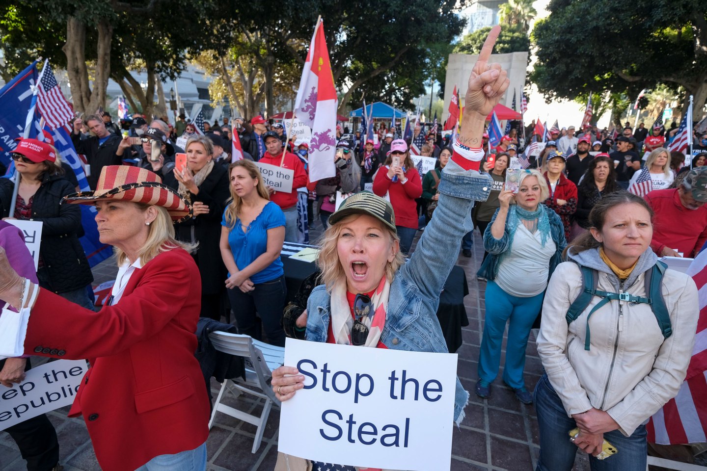 From Georgia to New Mexico to Oklahoma, crowds of people carried signs emblazoned “My vote was stolen!” and “Stop the steal” and waved Trump and U.S. flags. The heated demonstrations broke out as Congress tried to affirm Biden’s Electoral College victory.