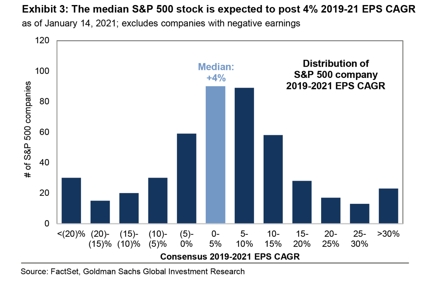 Looking forward, investors should focus on the full-year 2021 estimate, and compare that with the pre-pandemic full-year 2019 performance, Goldman advises. By that measure, the S&P looks a bit better going forward. The median company in the S&P is expected to post a 2019-21 EPS growth rate of +4%.