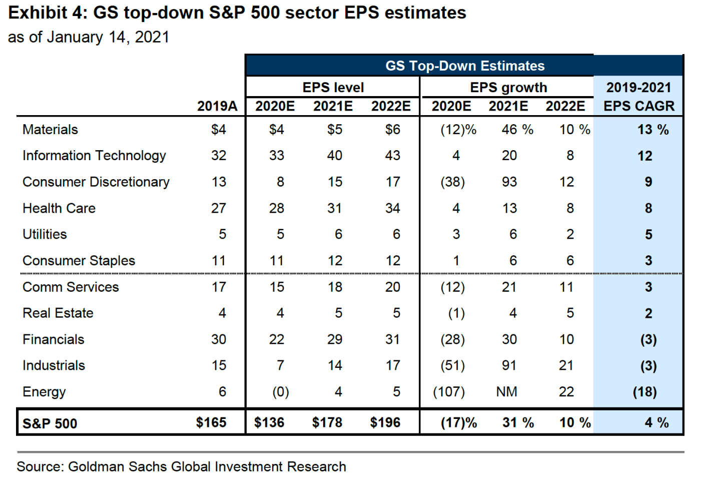 The Q4 2020-to-Q4-2019 comparison will be brutal. Across the S&P 500, Goldman predicts, EPS is expected to have fallen by 11% (take energy out of the equation, and it’s merely bad—an EPS decline of 8% year-on-year.) But there will be some bottom-line winners from the likes of health care, IT and materials.