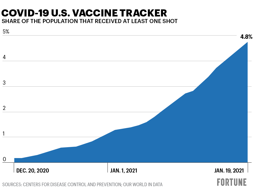 According to data from the Centers for Disease Control (CDC), 4.8% of the U.S. population had received at least one dose of the vaccine through Jan. 19, up from 2.8% a week ago. In total, roughly 15.7 million shots have been administered of the 31.2 million that had been distributed. Just over two million people have received both doses of vaccine.