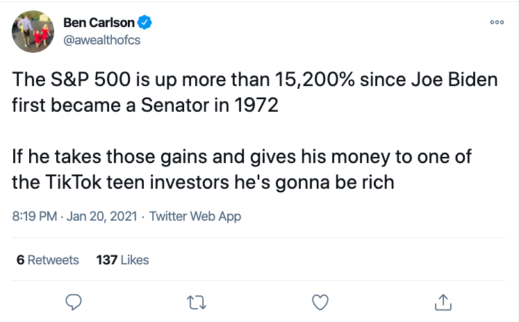 Good morning. It may have been a somewhat subdued, socially-distanced affair in Washington yesterday—LOWEST. INAUGURATION.TURNOUT. IN. MEMORY!, someone somewhere no doubt tweeted—but investors were out there, popping champagne corks.