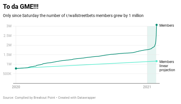 Don’t be fooled. WallStreetBets is no amateur chat room. It’s become a force in the markets. And it’s growing like gangbusters. The parabolic surge in subscribers in recent days (they’ve clocked more than 1 million new subs between Saturday and Wednesday afternoon, as the next chart below shows) resembles the share price chart for, ahem, GME.