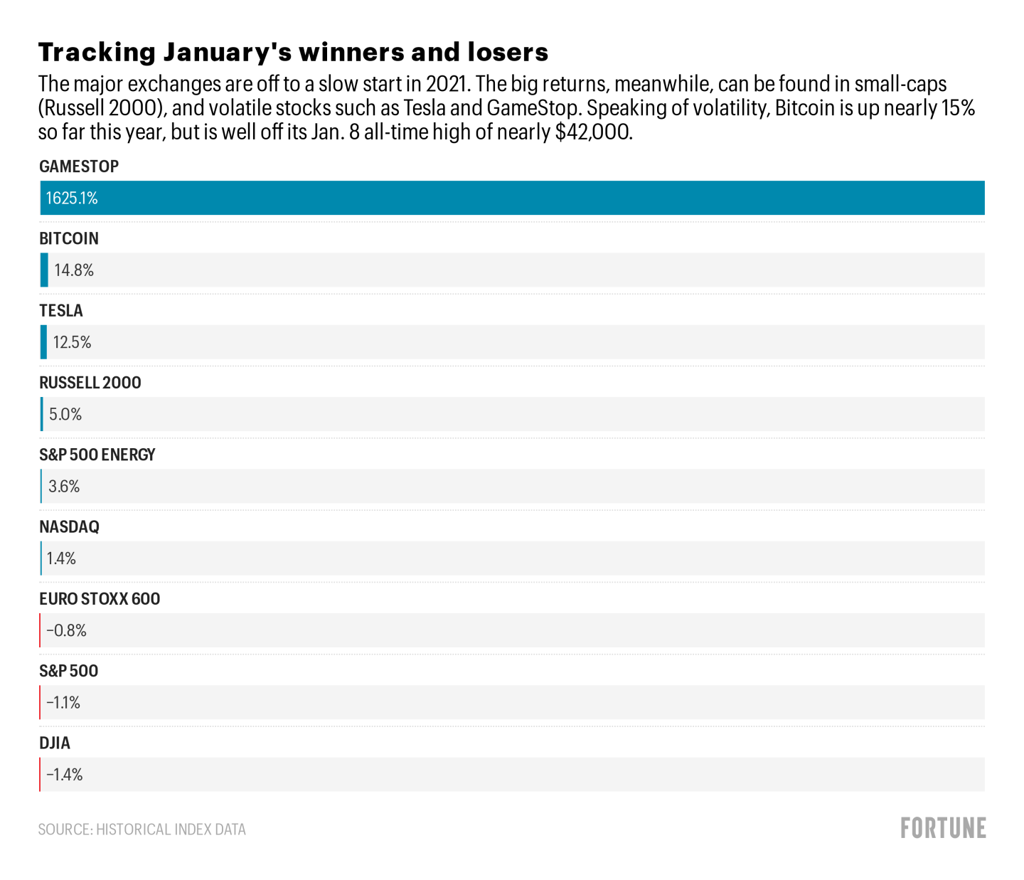 After GameStop, the big winners were Bitcoin (+14.8% in January), the small caps (+5%), energy (+3.6%) and tech (1.4%). The losers were the benchmark indexes and the Dow. The Euro Stoxx 600 was off 0.8% and the S&P fell 1.1%. If you have a Dow-targeted ETF in your portfolio you know full well it’s off to a bad start.