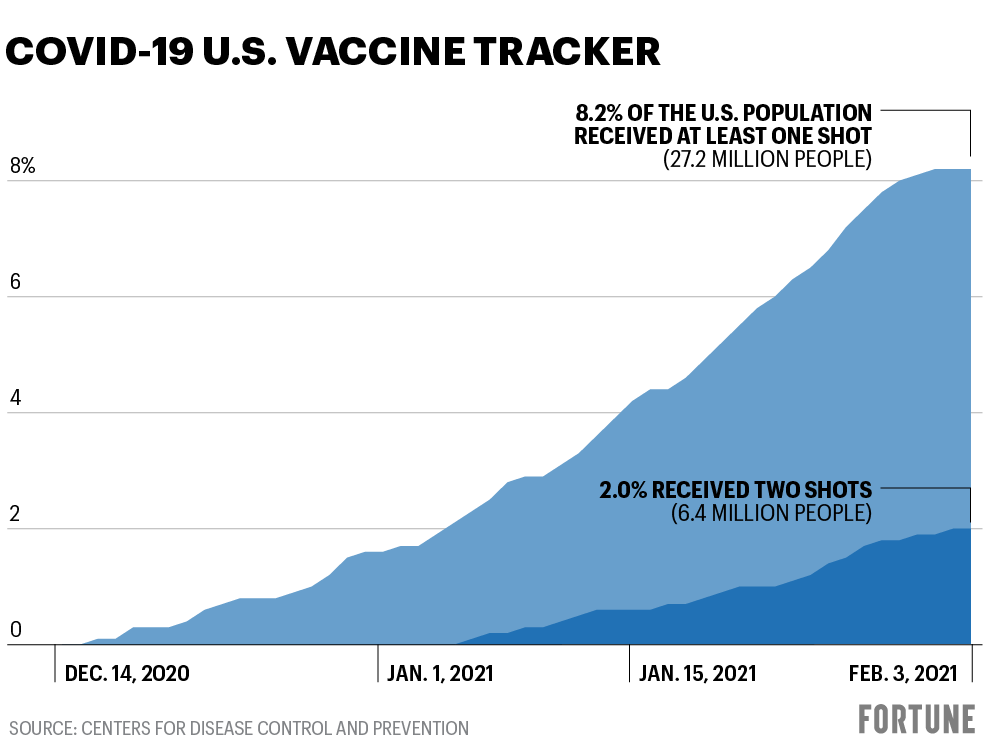 Through Tuesday, Feb. 2, 8.2% of the U.S. population, or 27.2 million people, had received at least one shot, according to data from the Centers for Disease Control, up from 24.7 million the week before. Another 6.4 million individuals had received both doses of the coronavirus vaccine. Of the 55.9 million doses of Pfizer and Moderna vaccines distributed across the U.S., roughly 61% have been administered.